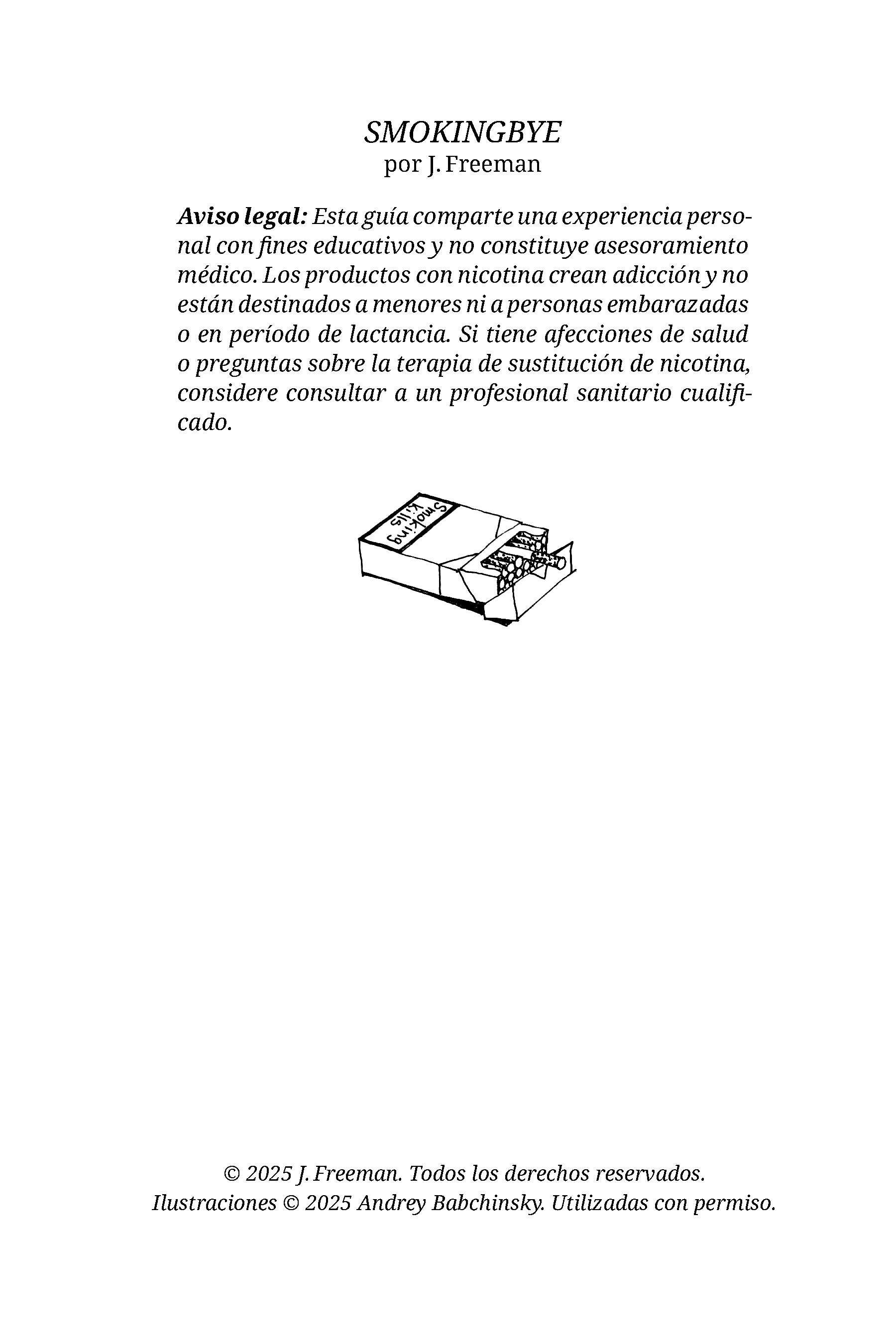 SmokingBye es una guía breve y estructurada en PDF para personas adultas que fuman o usan nicotina y desean dejarlo sin estrés, presión ni fuerza de voluntad heroica, mediante un enfoque de reducción gradual y tranquila (no “de golpe”).