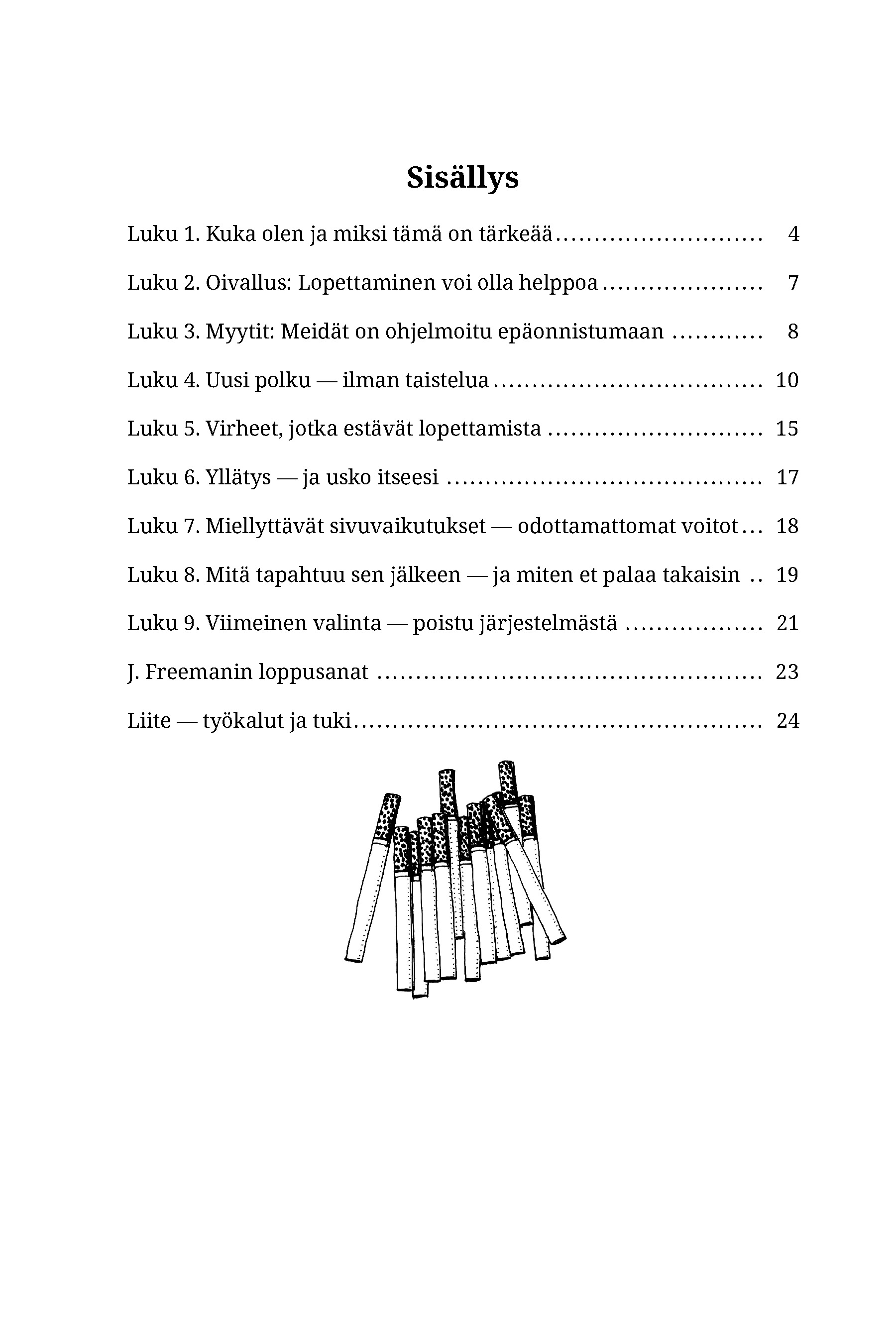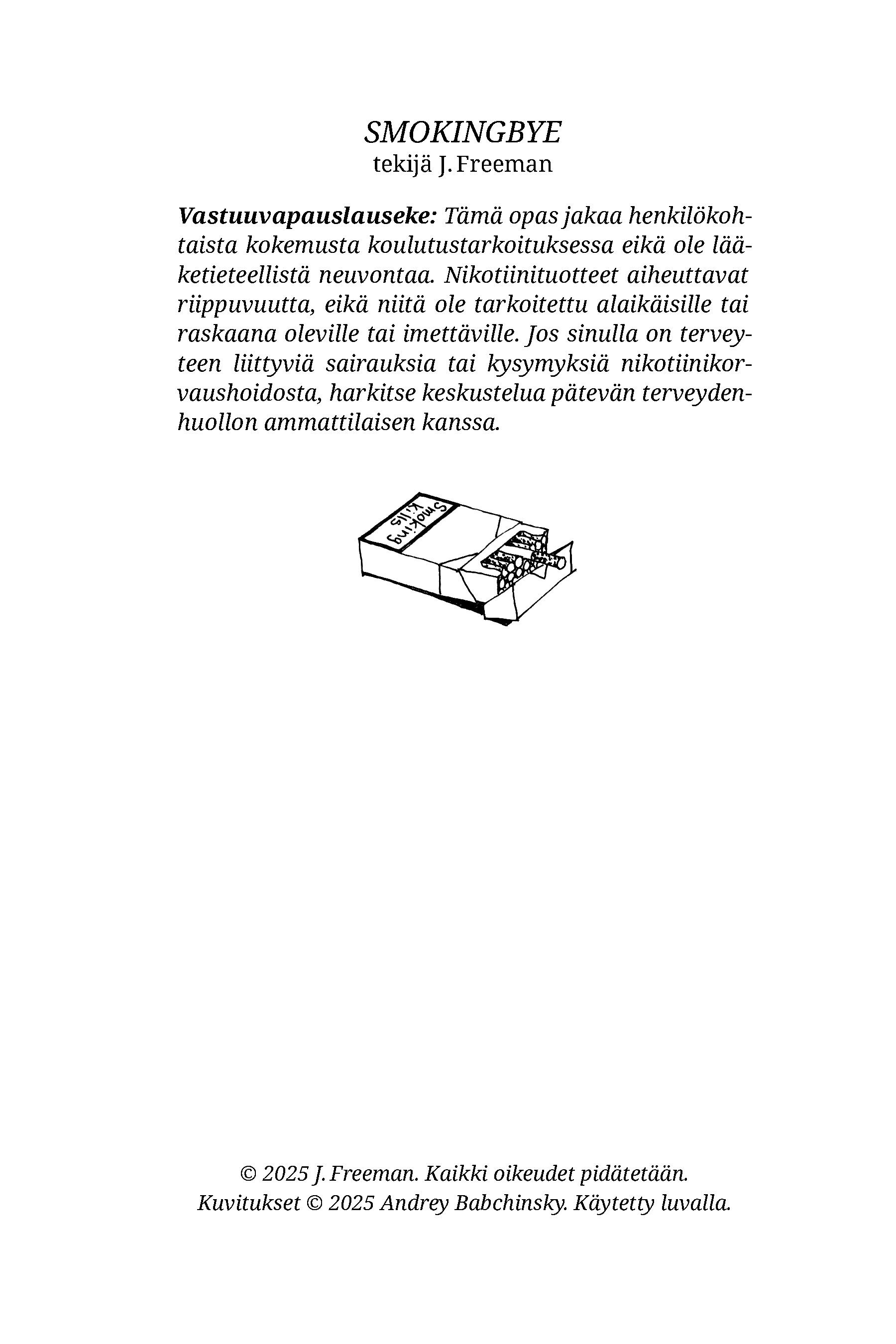 SmokingBye on lyhyt ja jäsennelty PDF-opas aikuisille tupakoitsijoille ja nikotiinituotteiden käyttäjille, jotka haluavat lopettaa ilman stressiä, painetta tai sankarillista tahdonvoimaa — rauhallisen ja asteittaisen vähentämisen avulla (ei ”kerrasta poikki”).