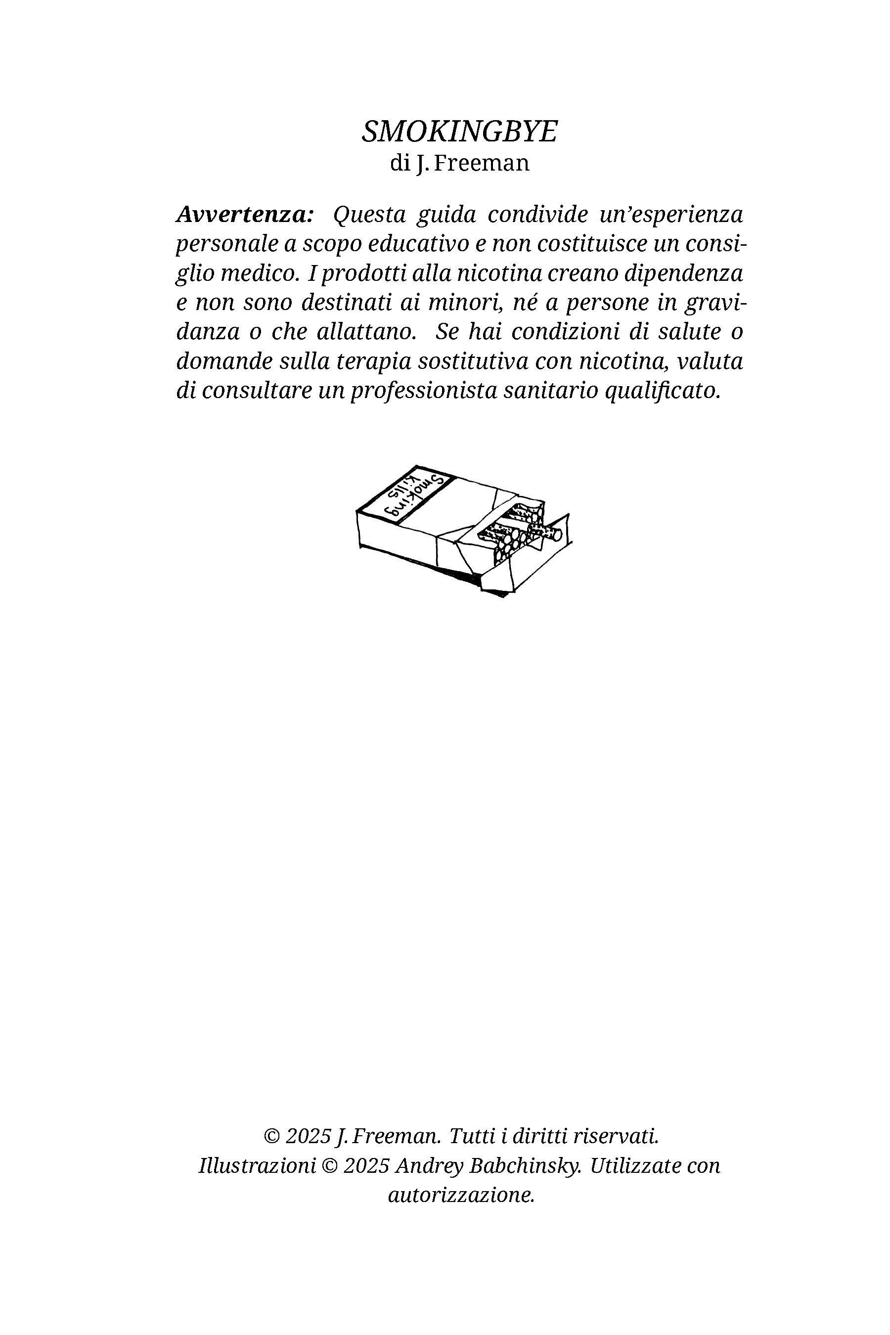 SmokingBye è una guida PDF breve e strutturata pensata per fumatori adulti e utilizzatori di nicotina che desiderano smettere senza stress, pressioni o sforzi eroici di forza di volontà, seguendo un approccio calmo e graduale alla riduzione (non “di colpo”).