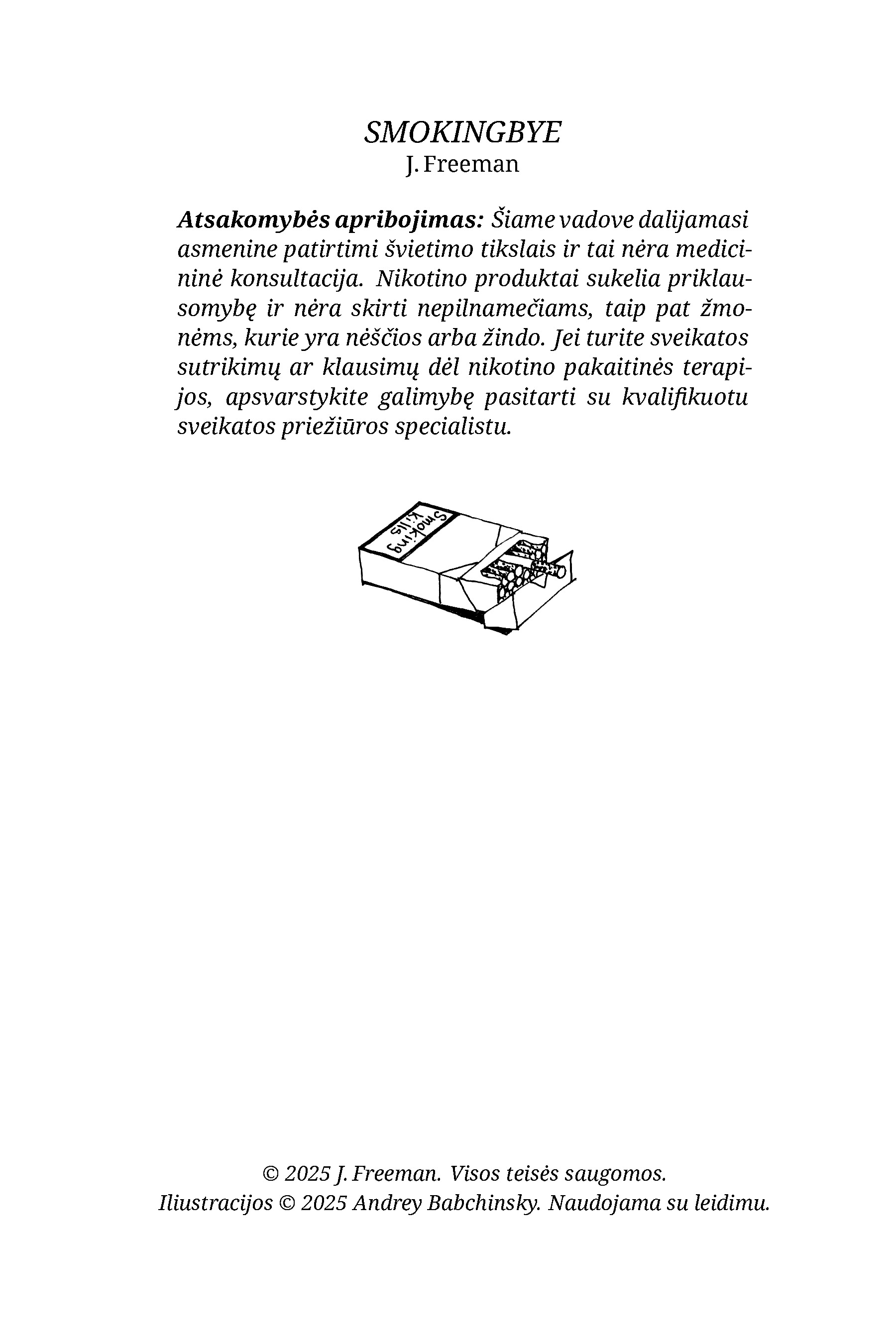 SmokingBye — tai trumpas, struktūruotas PDF gidas suaugusiems rūkaliams ir nikotino vartotojams, kurie nori mesti be streso, spaudimo ar herojiškų valios pastangų — taikant ramų, laipsniško mažinimo metodą (ne „šaltą nutraukimą“).