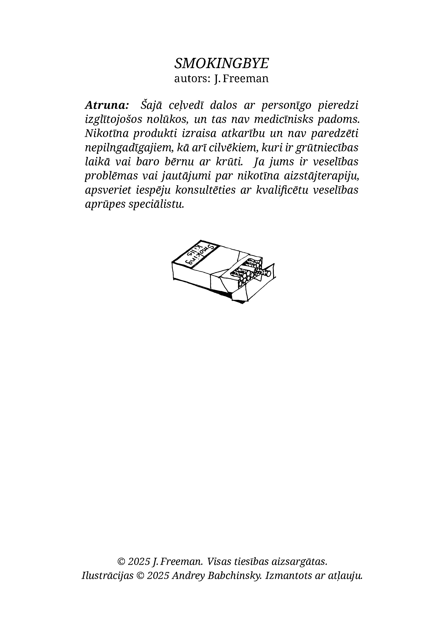 SmokingBye ir īss, strukturēts PDF ceļvedis pieaugušiem smēķētājiem un nikotīna lietotājiem, kuri vēlas atmest bez stresa, spiediena vai varoņdarba gribasspēka — izmantojot mierīgu, pakāpenisku samazināšanas pieeju (nevis pēkšņu atmešanu).