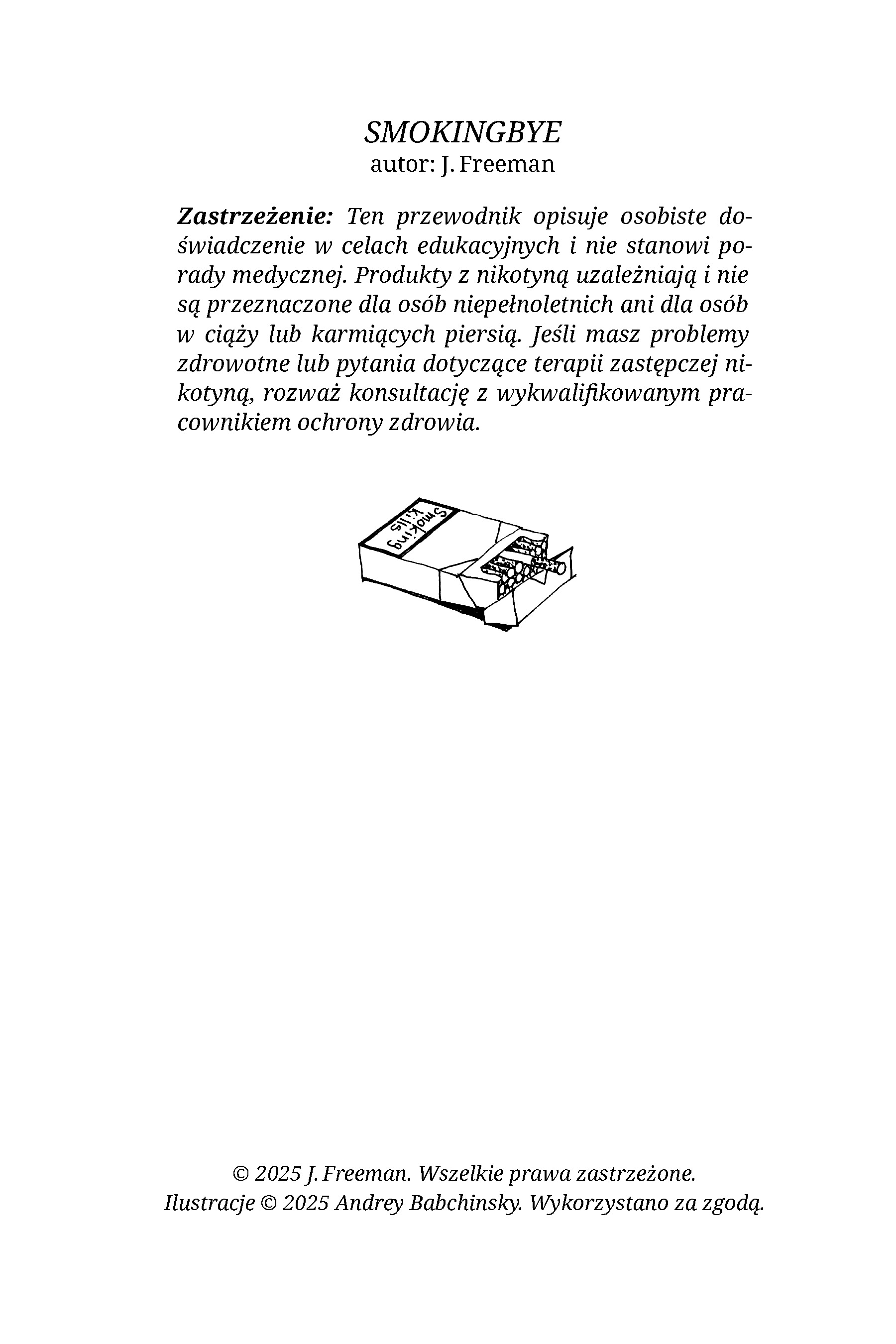 SmokingBye to krótki, uporządkowany poradnik PDF dla dorosłych palaczy i użytkowników nikotyny, którzy chcą rzucić bez stresu, presji ani heroicznej siły woli — stosując spokojne, stopniowe podejście do redukcji (a nie „cold turkey”).